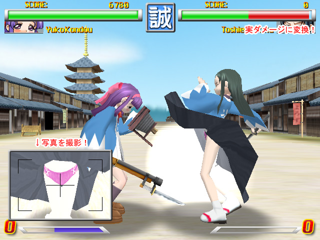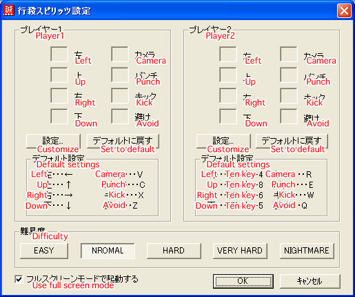 Please proceed the game advantageously to your character by making the most of tricks of your character. *This is a chart when you are standing on the left. When standing on the right, direction of lever operation is left-right reversal. +Configuration Please select red icon registered to Startup Menu, then Setup tool stars. ![]() With this tool, you can setup keys to be used, challenge level, screen mode. When you change a button to be used, click "Customize" button of a player on the side you want to change. As you are asked about buttons to be setup in order of left, up, right, bottom, camera, punch, kick, duck, press a key (or button on game pad) that you want to use. +Contact us Please send your comment, request or bug report by e-mail. Support information is available to you on our website. +Addenda "CONGRATURATIONS" is not a printing error. It is Japanian. All you panty are belong to us. 20060616 |